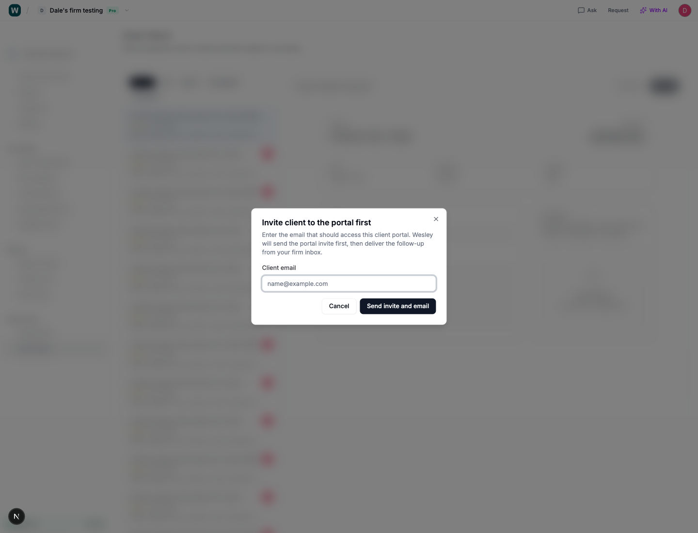 Ask Client can trigger a portal invite and send the follow-up through a controlled workflow instead of another disconnected email chain.