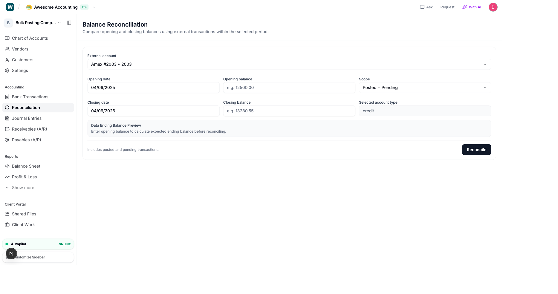 The form is not the point. The point is that reconciliation happens in context, against the real transaction data and account scope the team is already using.