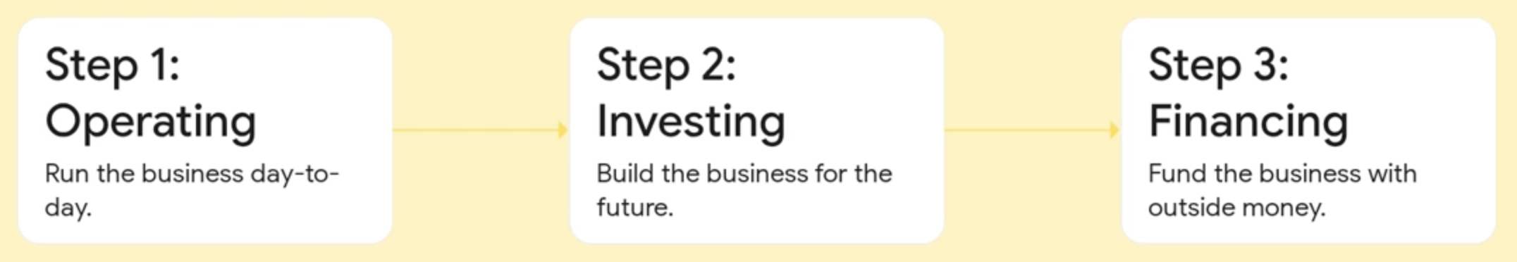This final section deals with the money exchanged between your business, its owners, and lenders. This covers things like receiving loans, repaying loan principal, owner contributions to the business, or owner draws (money you take out).
