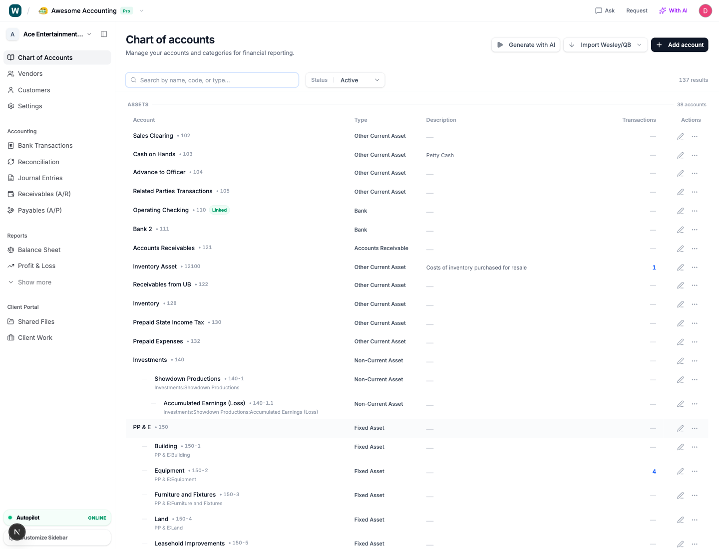 Wesley is designed for bank-statement-first bookkeeping. Once the data is uploaded, it can help establish a chart of accounts that is much closer to how the client actually operates and how the books will ultimately need to be reviewed for tax reporting.