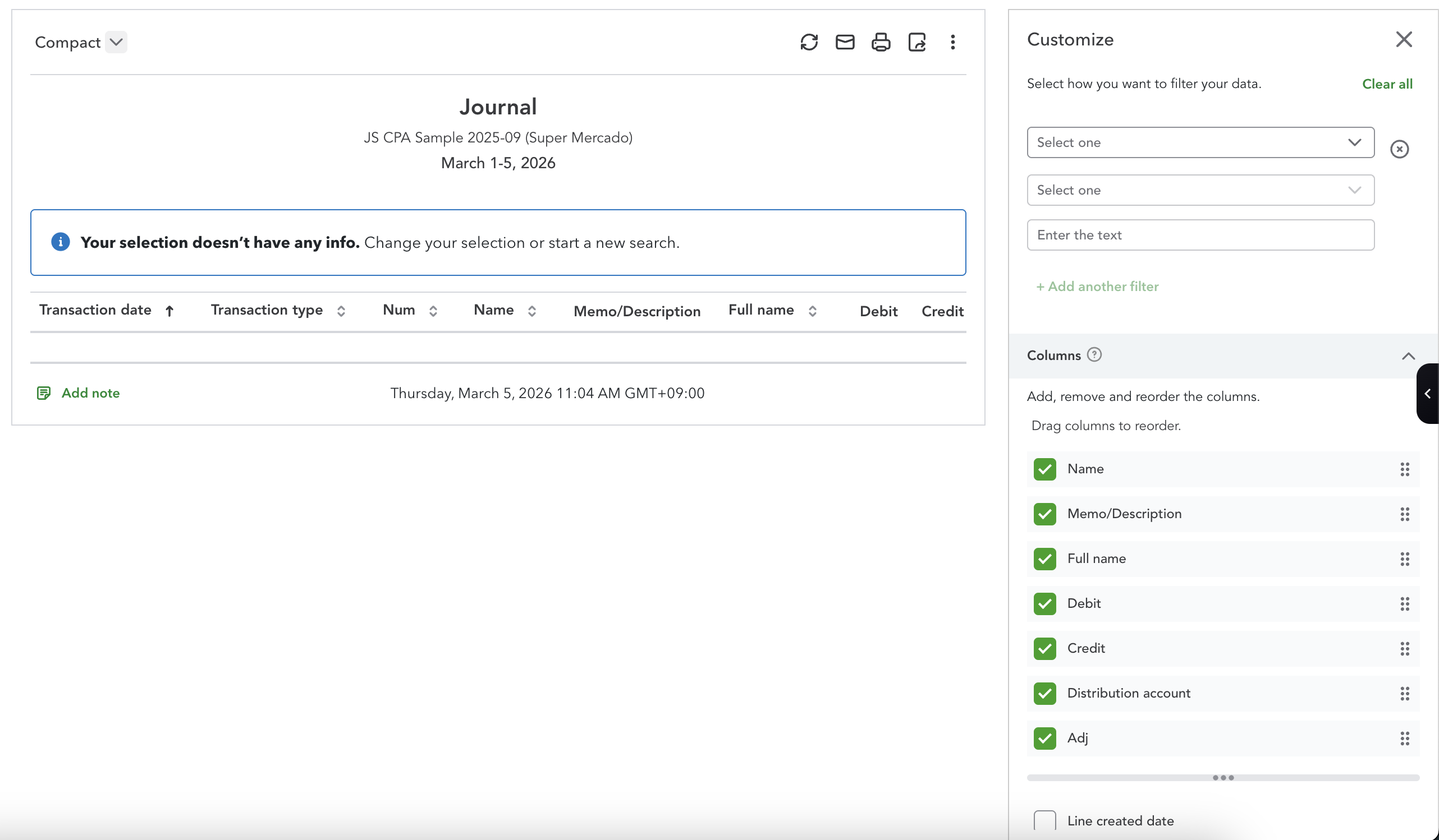 Distribution accountandAdjColumns are included. Full Columns: Transaction date, Transaction type, Num, Name, Memo/Description, Full name, Debit, Credit, Distribution Account, Adj
